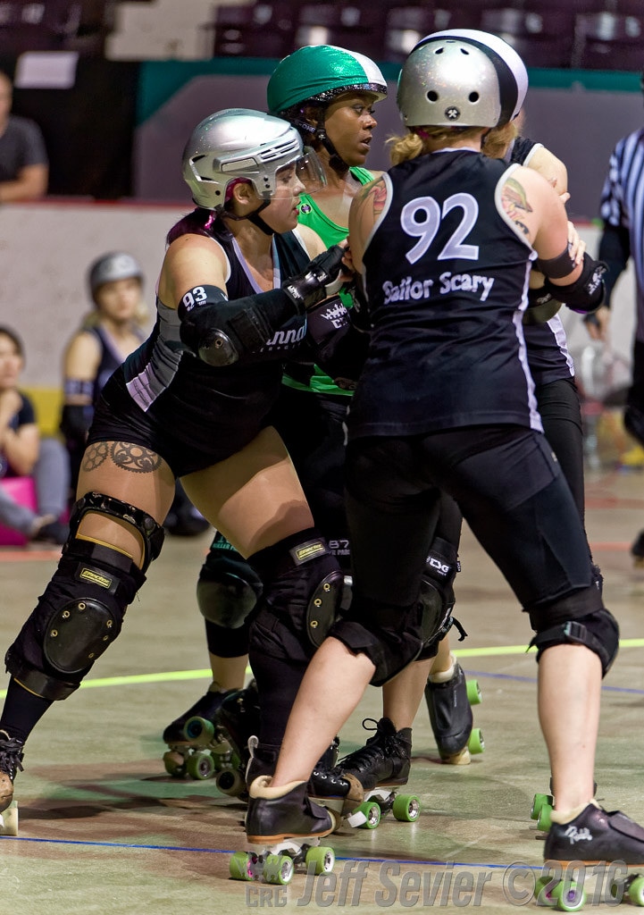 Next up were the 2015 D2 finalists, Demolition City Roller Derby (Evansville, IN). What made that game especially significant was the previous match-up: a Demolition City demolition of Cincinnati by almost 200 points that kicked off the Black Sheep’s gut-wrenching, winless 2014 season. The 2016 squad was a much different team, though, and Cincinnati won the rematch 230-88, most importantly earning them their highest ranking score of the season at 474.54 rankings points.