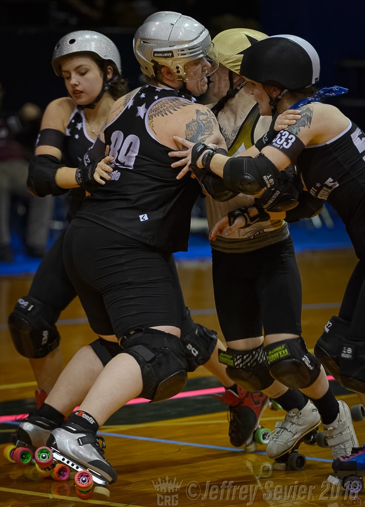 Watching CRG blocker Hustle in action today, you’d never guess that on her first night on skates, she clung to the rink wall like a cat avoiding a bath (those are her own words — read more of them here). She’s confident, agile and strong, and she always seems to be in the right place at the right time, much to the frustration of opposing jammers.